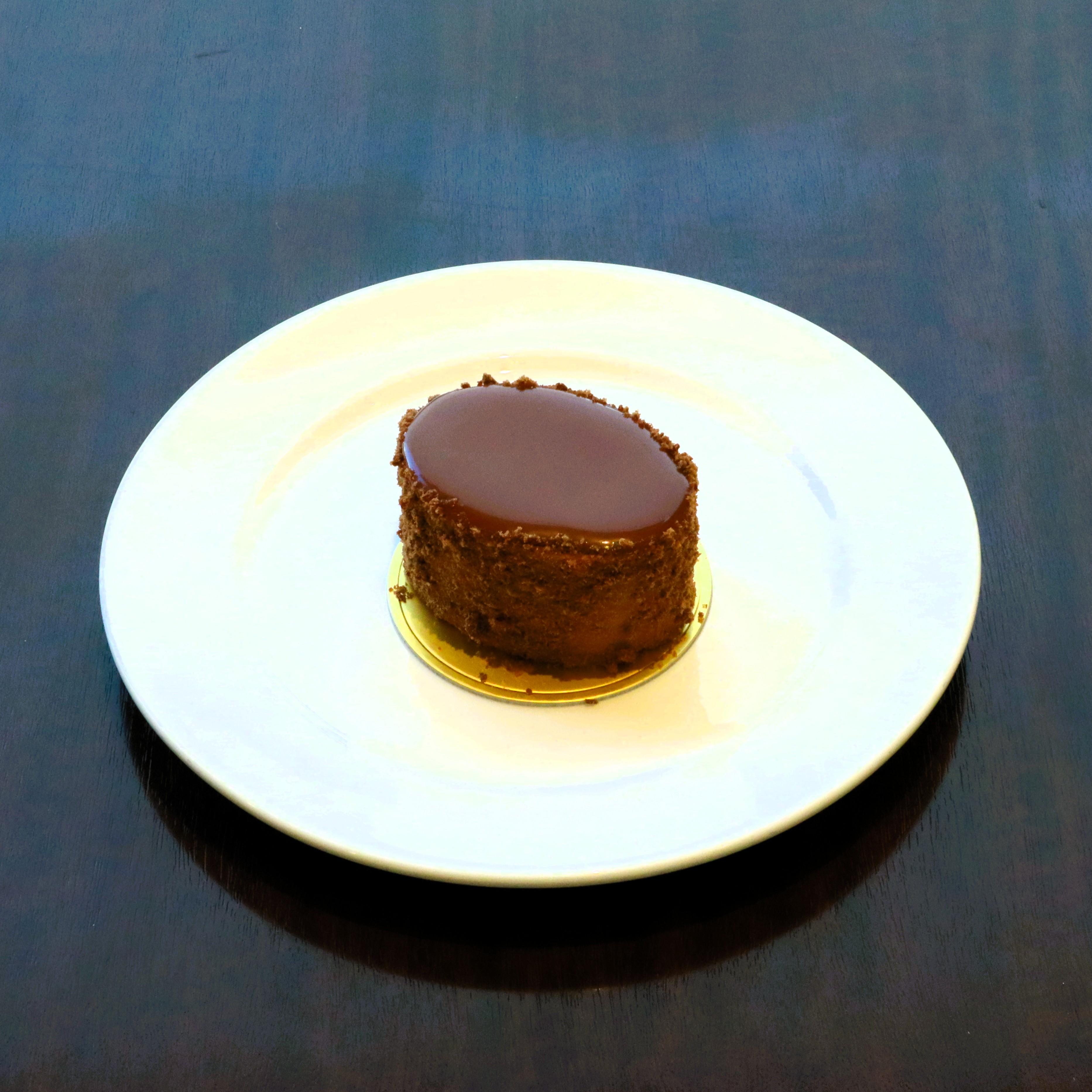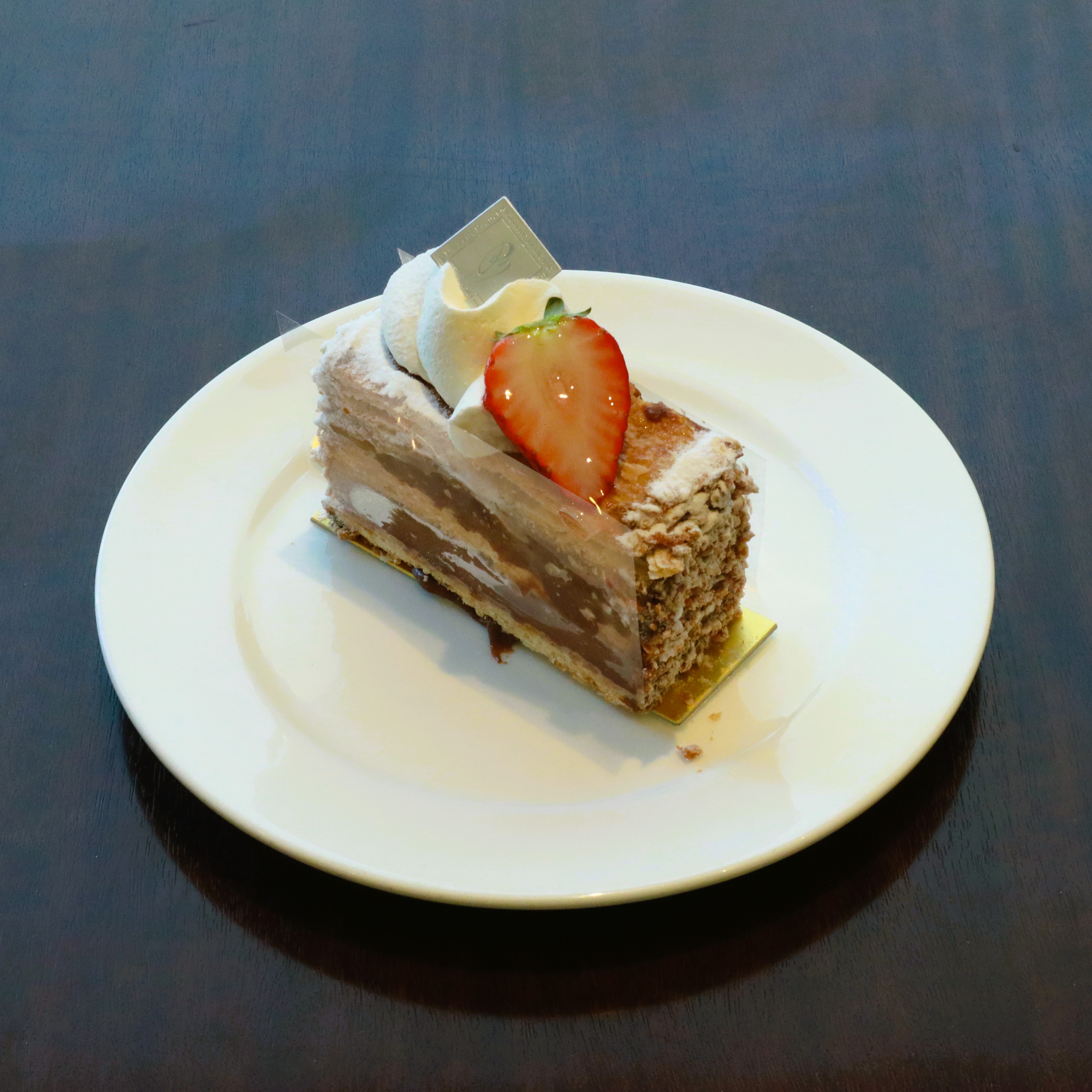 しっとりとしたガトー・ショコラに、キャラメルがけしたヘーゼルナッツを入れて焼き上げ、生クリームを重ねました。