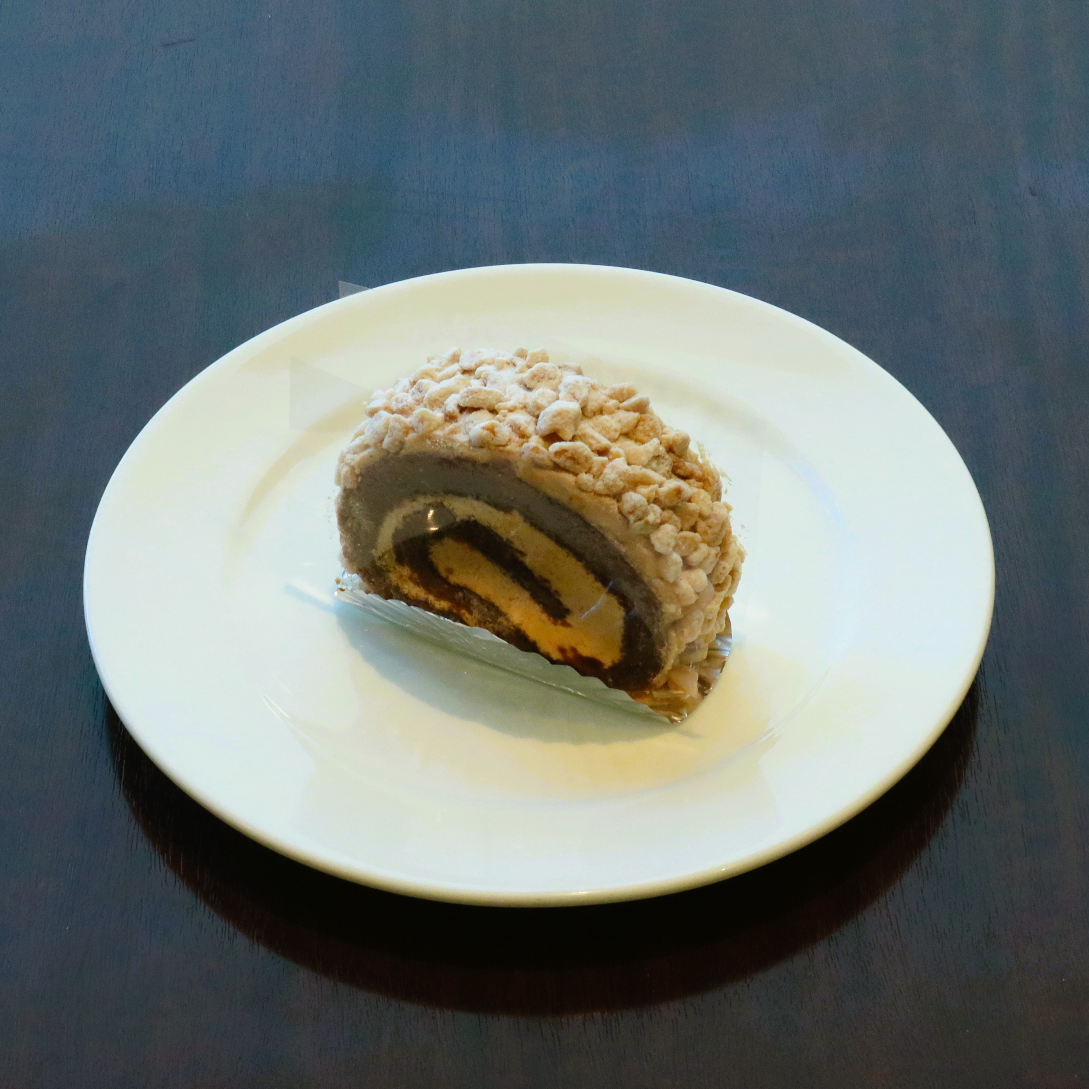 アーモンドをふんだんに使ったコーヒー風味のスポンジに、プラリネクリームを巻き、香ばしくローストしたアーモンドをたっぷりのせました。