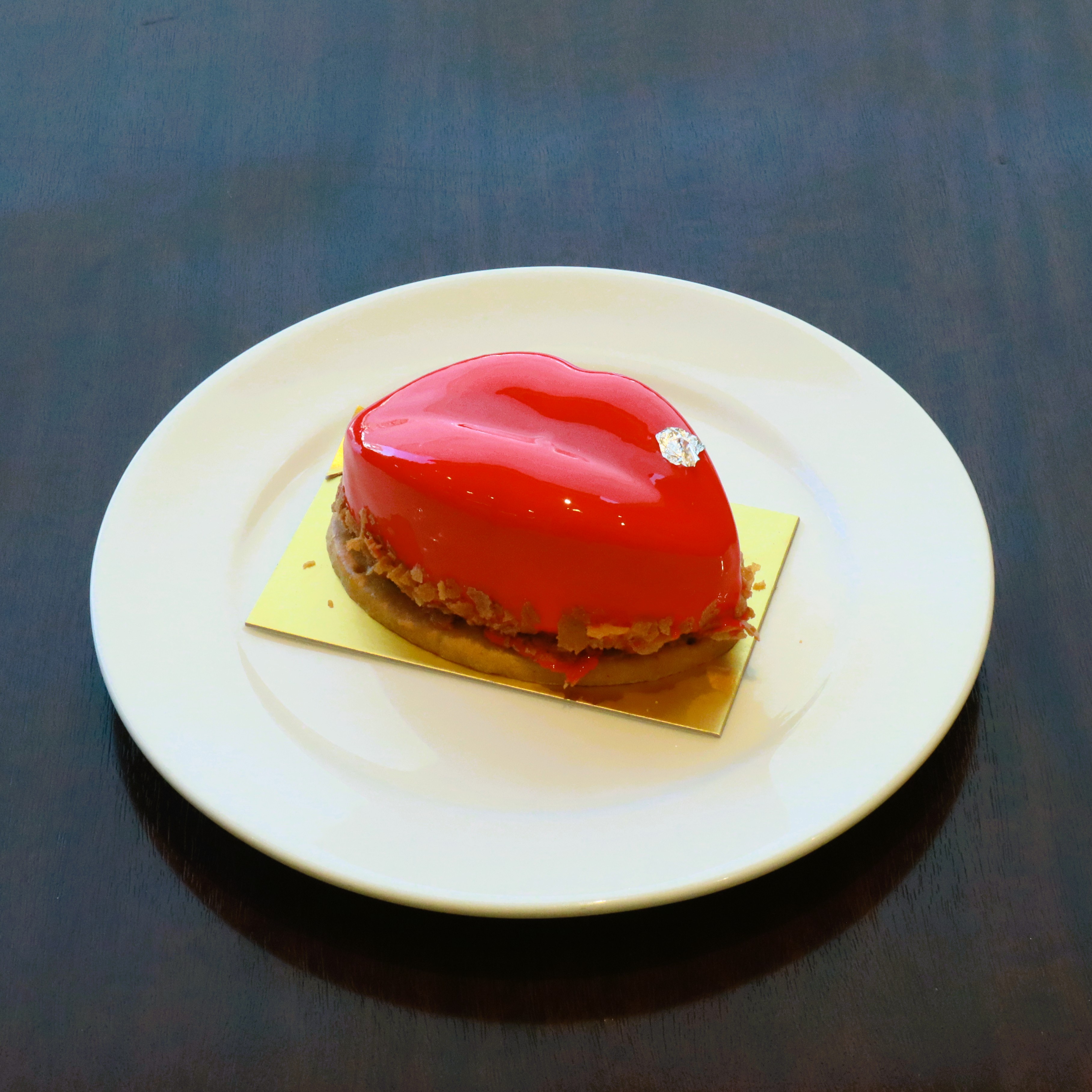 いちごとホワイトチョコレートのクリーム、サクランボのコンフィ、バニラのクリームを重ね、いちごのグラサージュで鮮やかに彩りました。